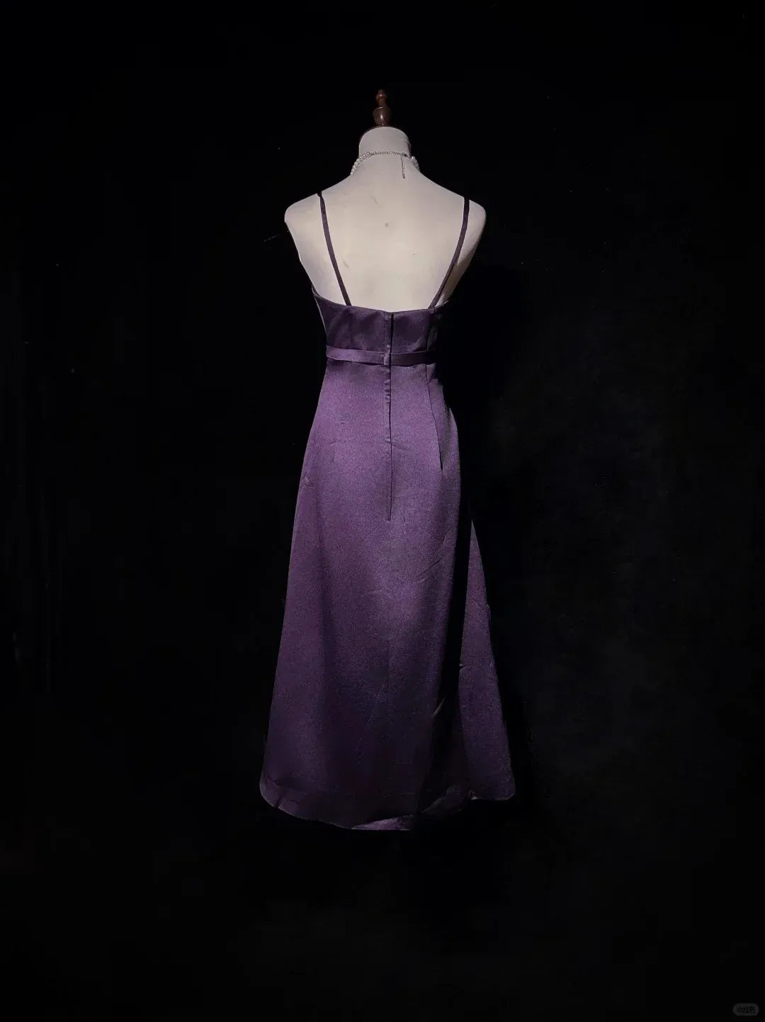 This plum satin midi dress features thin spaghetti straps, a structured sweetheart bodice, and a sparkling crystal-embellished waistband (adding a touch of glamour). The lustrous satin fabric and rich plum tone balance regal sophistication with modern elegance, making it ideal for bridesmaid events, formal dinners, or upscale holiday gatherings—combines understated luxury with polished, refined charm.