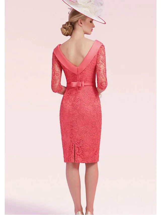 Mother of the Bride Dress Plus Size Bateau Neck Knee Length Lace Satin Half Sleeve with Sash Ribbon Bow(s) Split Front