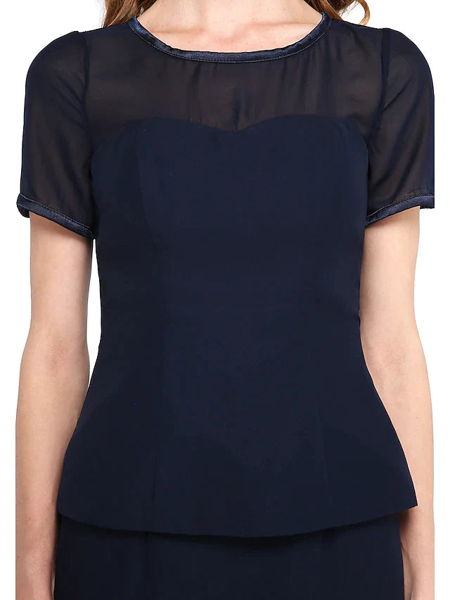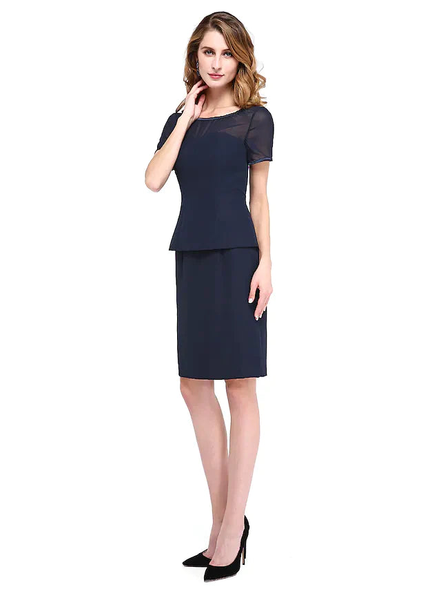 Mother of the Bride Dress Two Piece Wrap Included Jewel Neck Knee Length Chiffon Lace Length Sleeve withCrystal Brooch Sash Ribbon