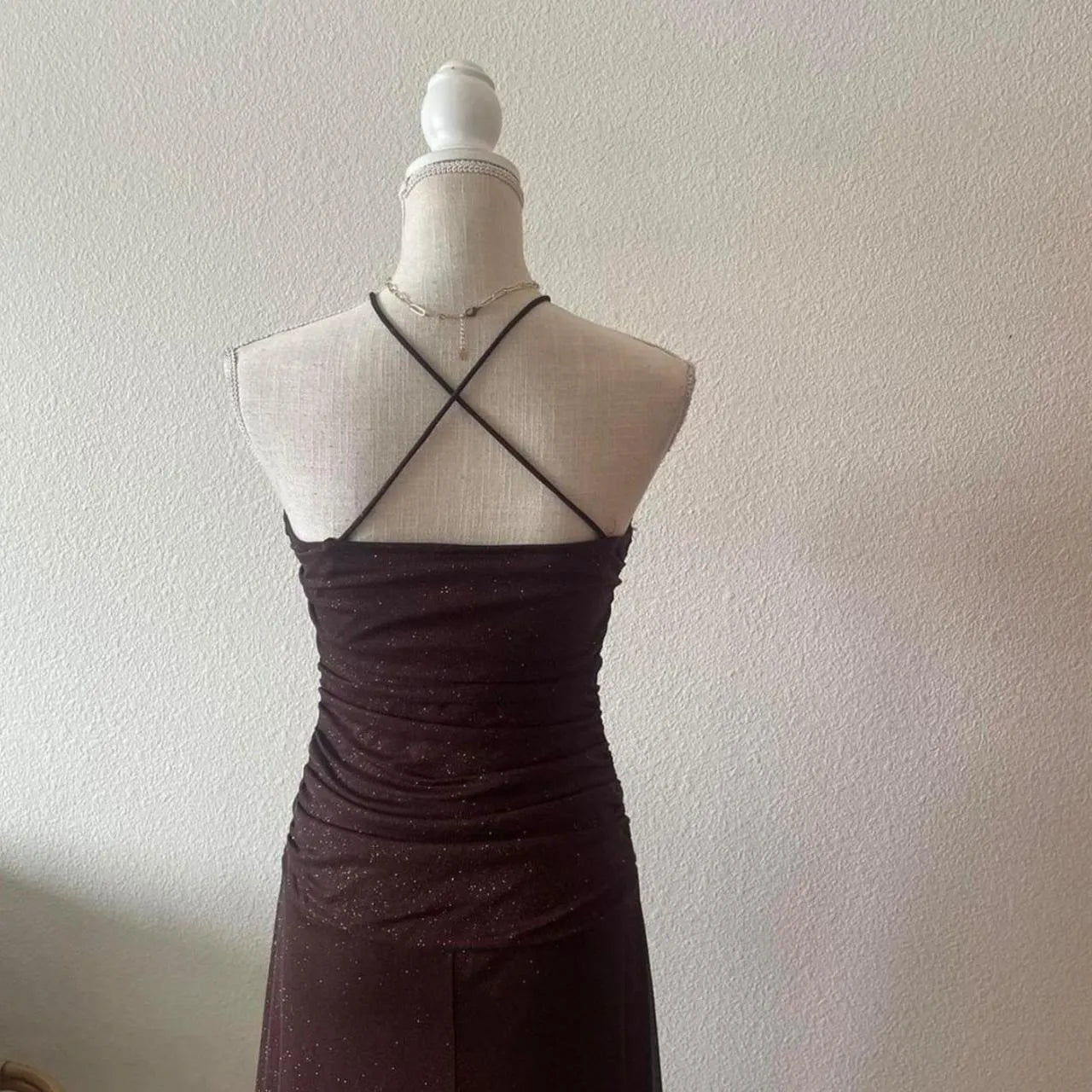 This brown glitter gown features a ruched halter neckline with a gold accent, a figure-skimming bodice, a flowing A-line skirt, and a criss-cross open back. The shimmering glitter fabric and rich, warm hue balance 90s-inspired glamour with modern sensuality, making it ideal for proms, retro-themed parties, or upscale cocktail events—combines effortless drape with bold, eye-catching allure.