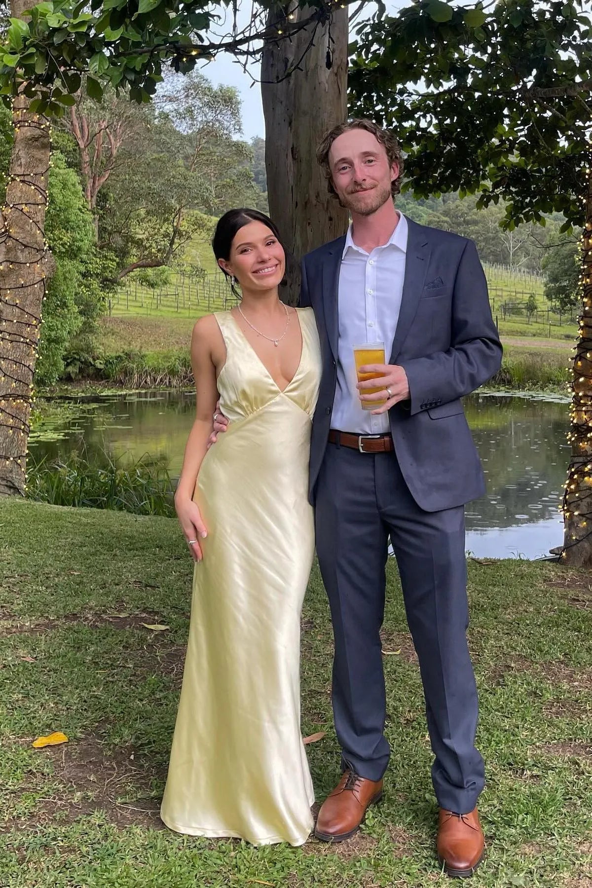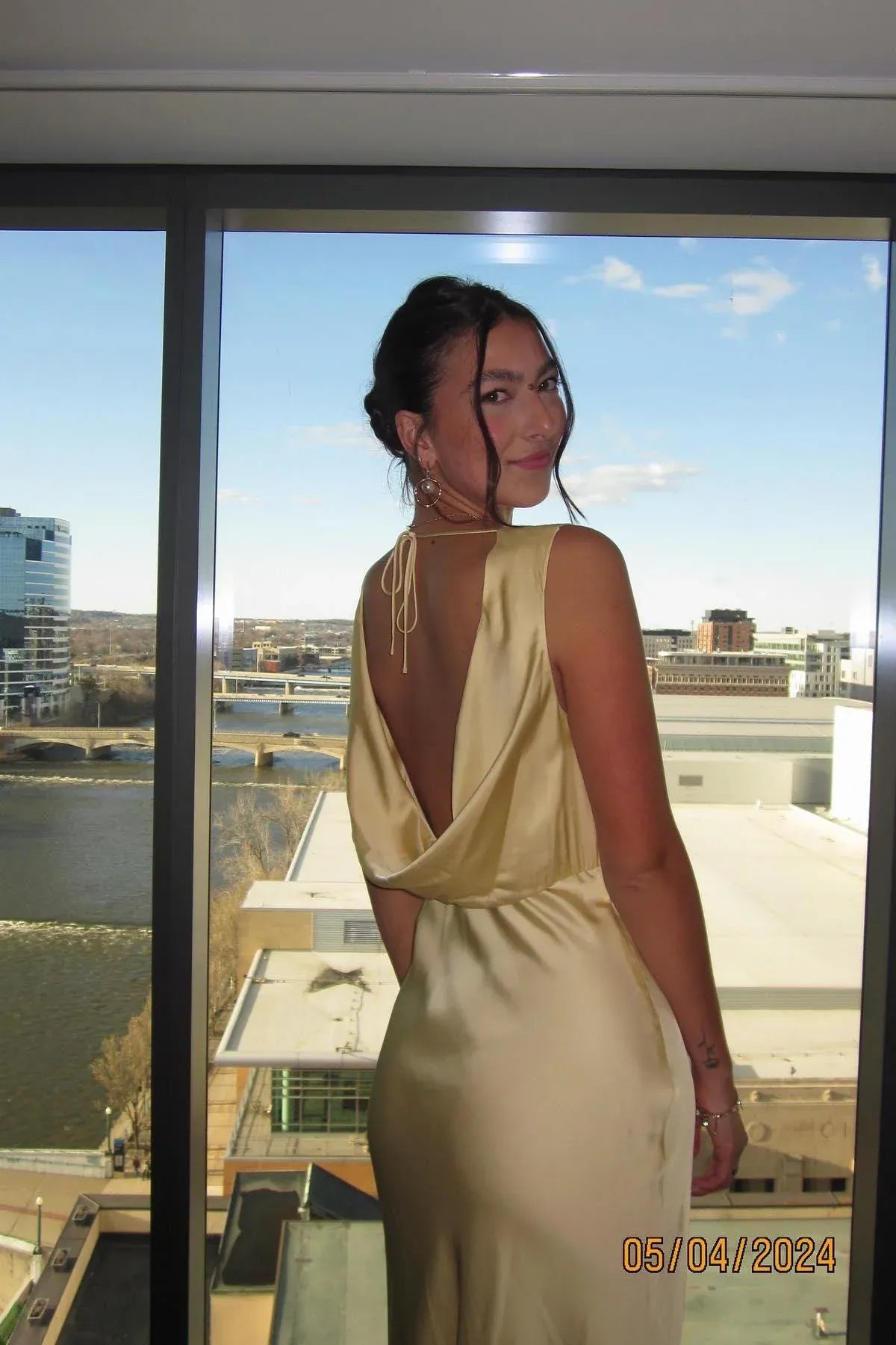 This champagne satin maxi dress features a deep V-neckline, a sleeveless silhouette, a dramatic open back (with a tie detail), and a flowing fit. The lustrous satin texture and soft champagne tone balance understated luxury with modern elegance, making it ideal for upscale brunch events, cocktail parties, or daytime wedding receptions—combines sleek tailoring with polished, timeless allure.